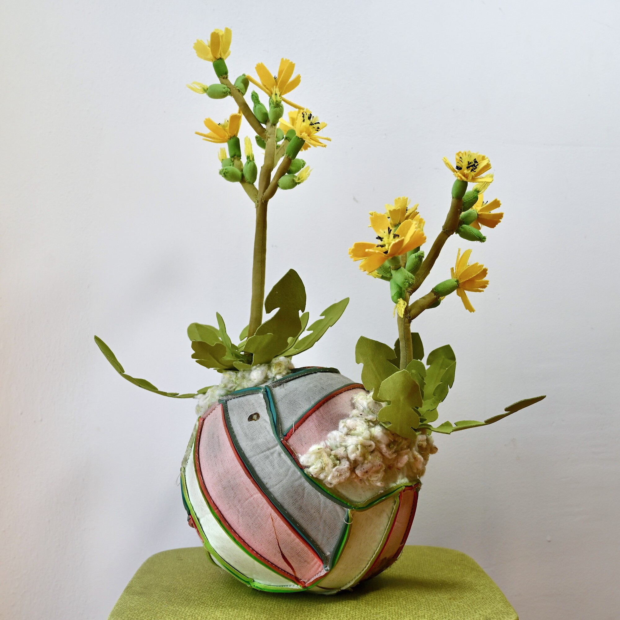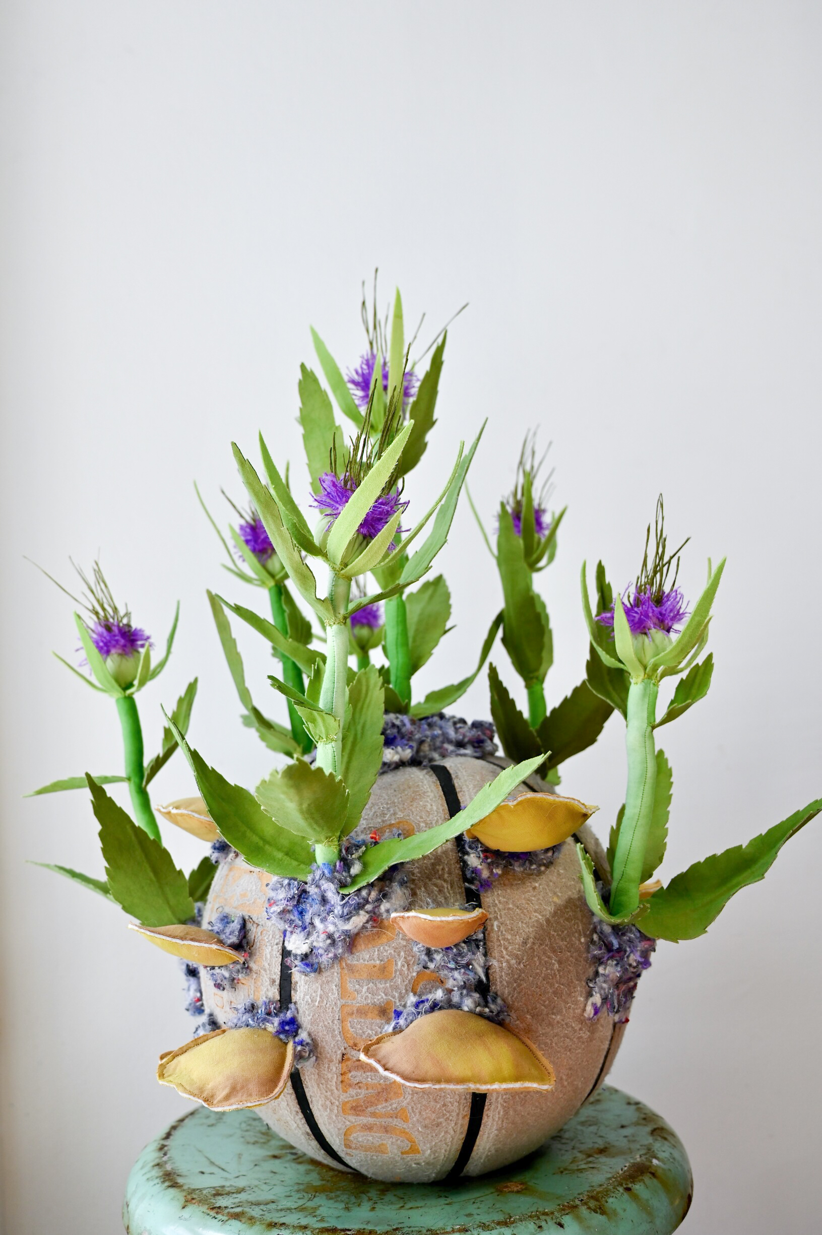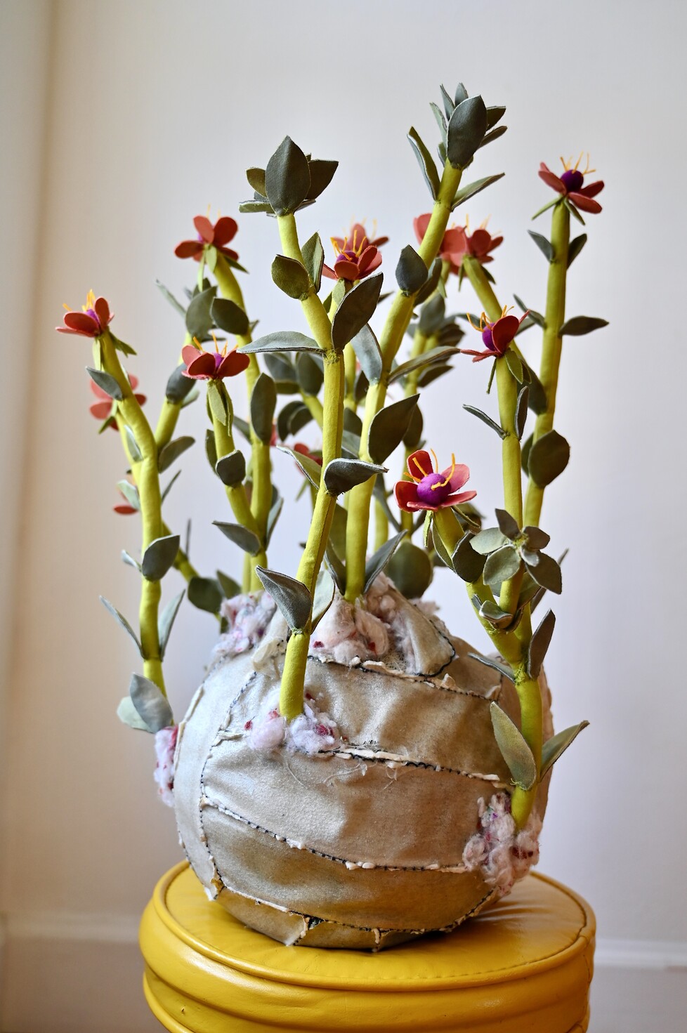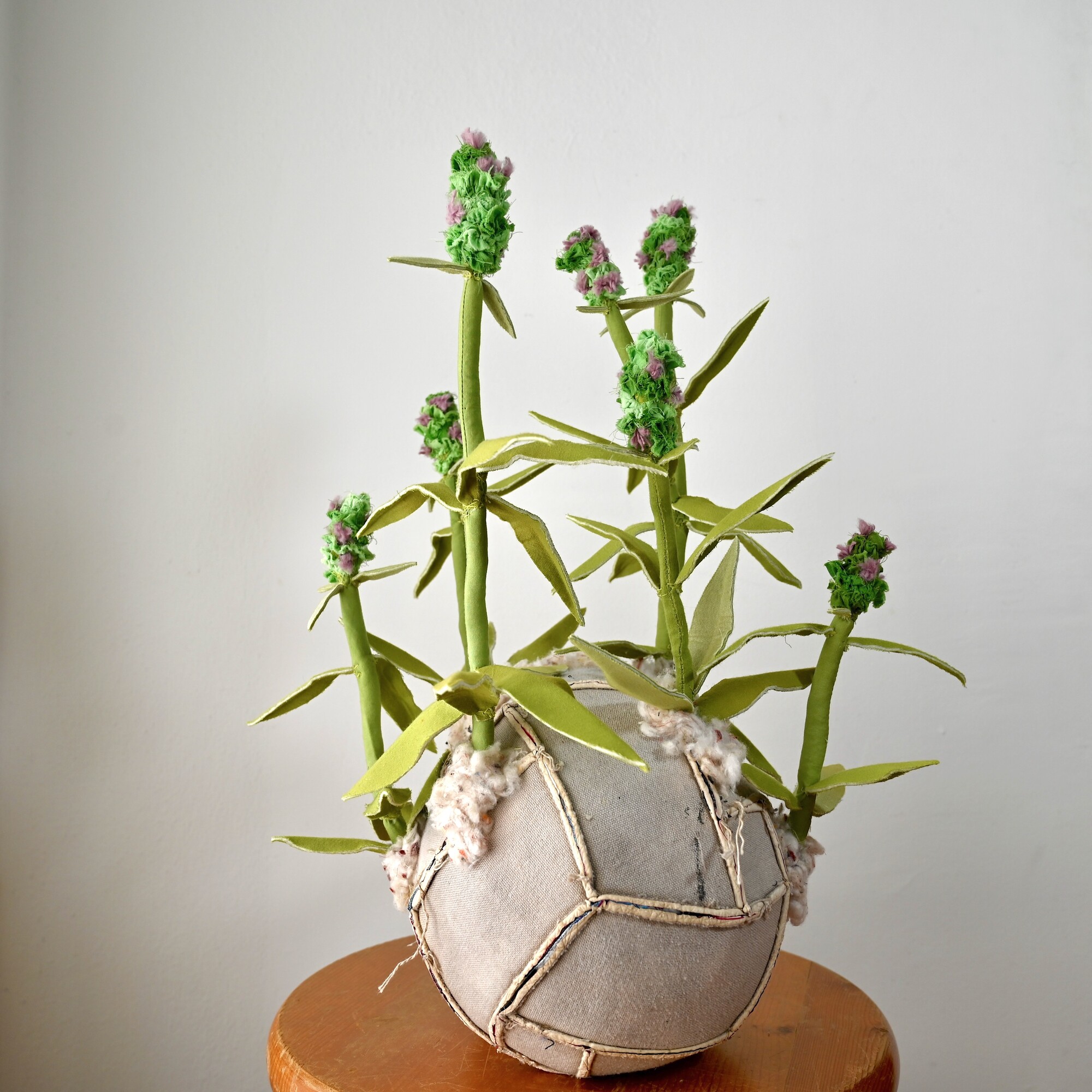 Her work is rooted in processes of collection and reconstitution, utilizing discarded and found materials—particularly vintage fabrics and plastic remnants—to construct intricately hand-sewn, biomorphic forms. Drawing inspiration from botanical and medicinal systems, Alfonso’s sculptures evoke flowers, fungi, and organic growth structures, functioning as both aesthetic objects and symbolic reflections on cycles of decay, healing, and renewal.