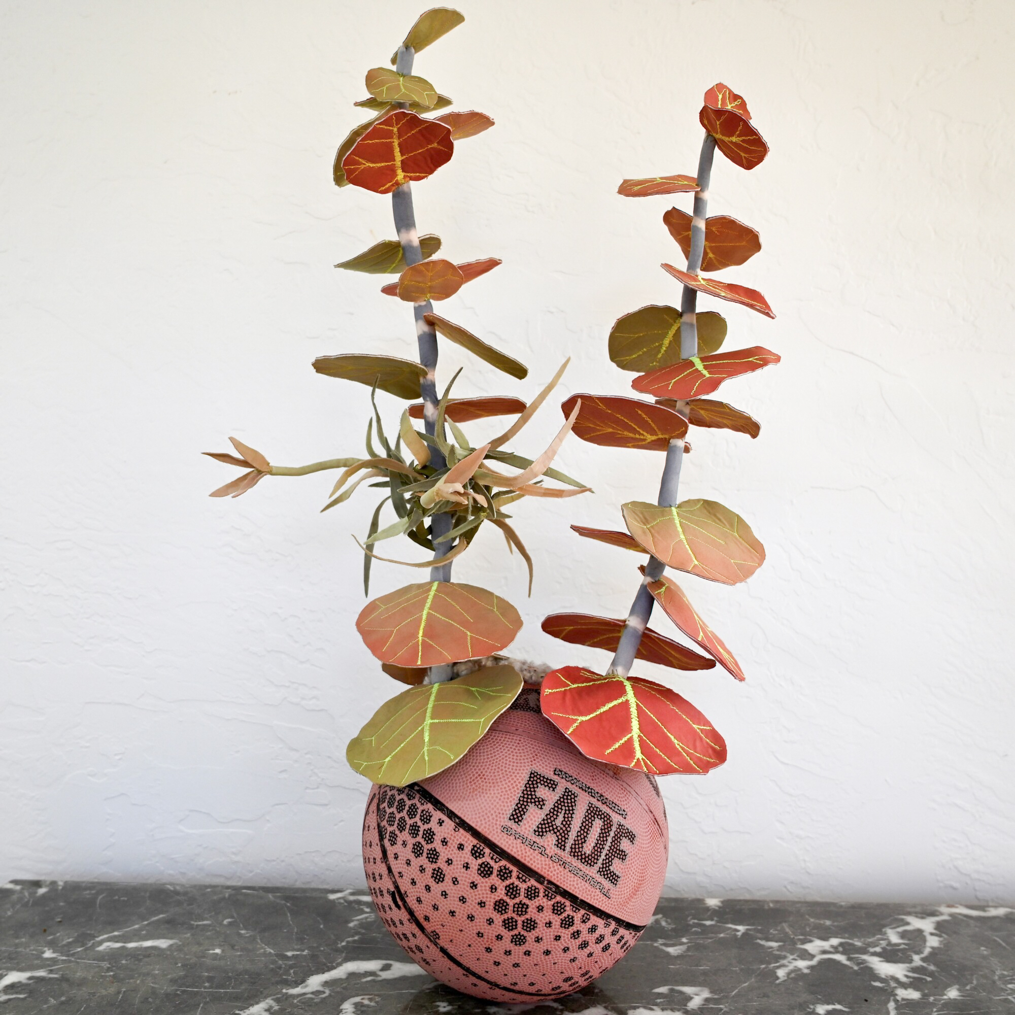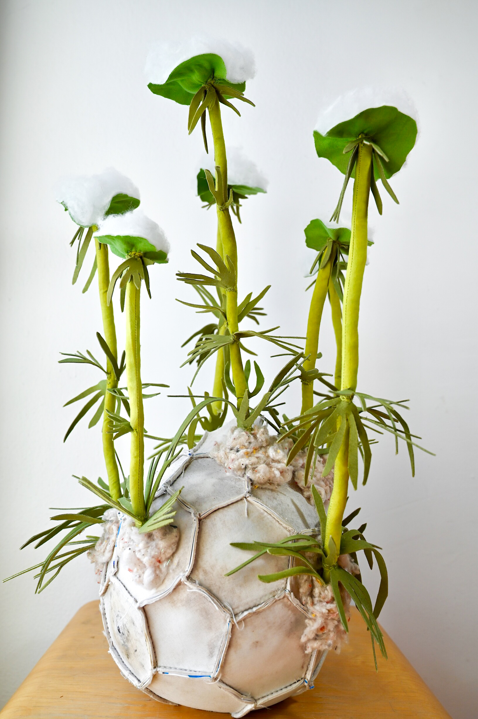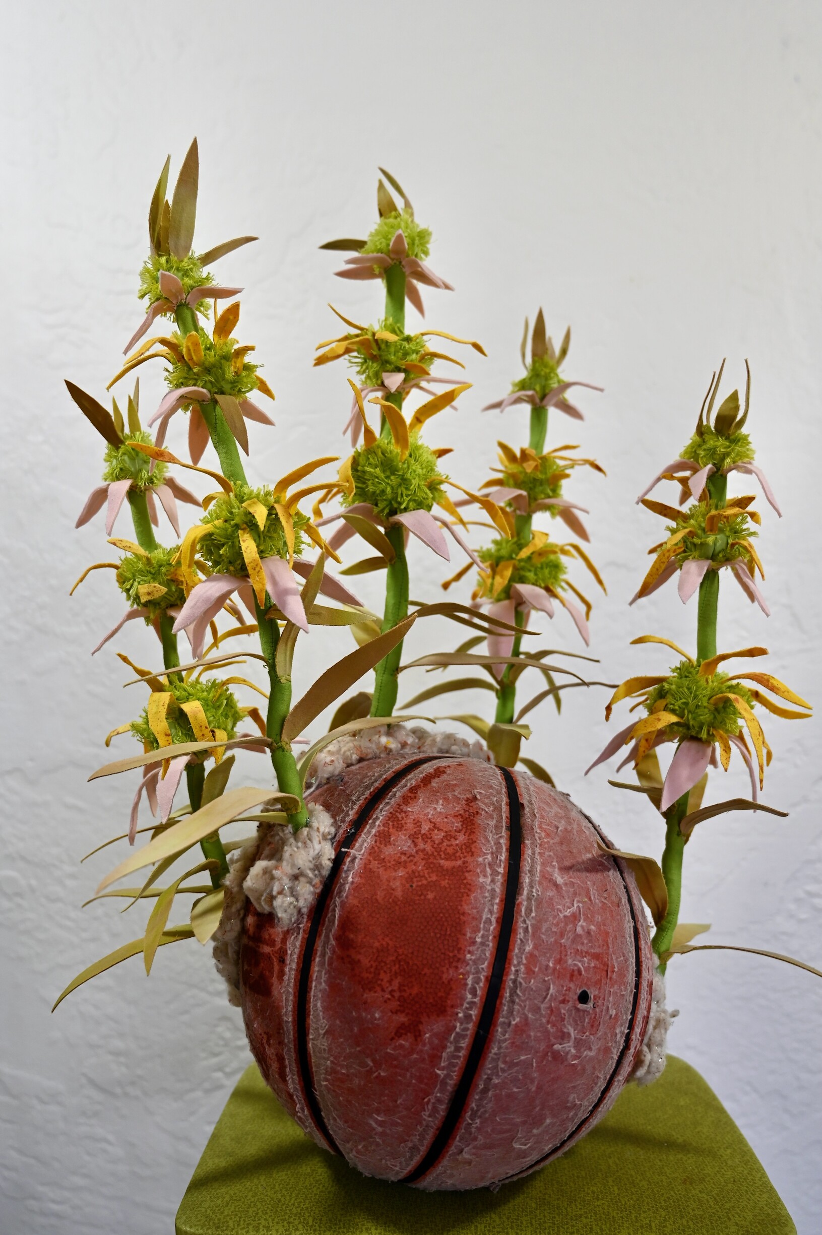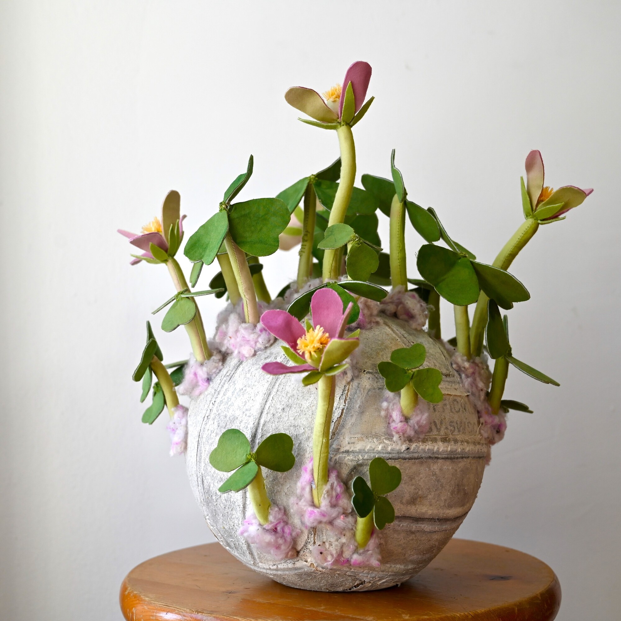 Her work is rooted in processes of collection and reconstitution, utilizing discarded and found materials—particularly vintage fabrics and plastic remnants—to construct intricately hand-sewn, biomorphic forms. Drawing inspiration from botanical and medicinal systems, Alfonso’s sculptures evoke flowers, fungi, and organic growth structures, functioning as both aesthetic objects and symbolic reflections on cycles of decay, healing, and renewal.