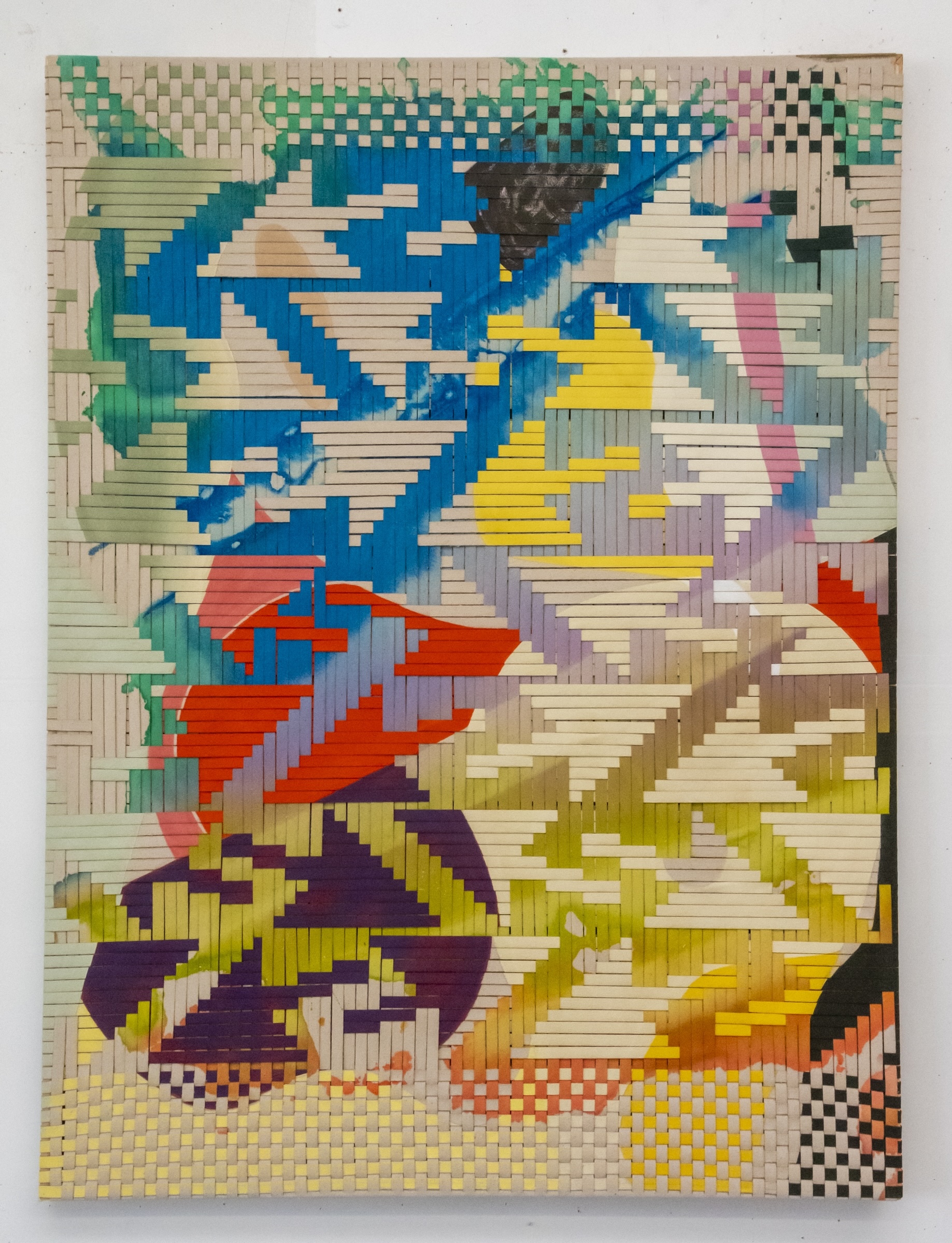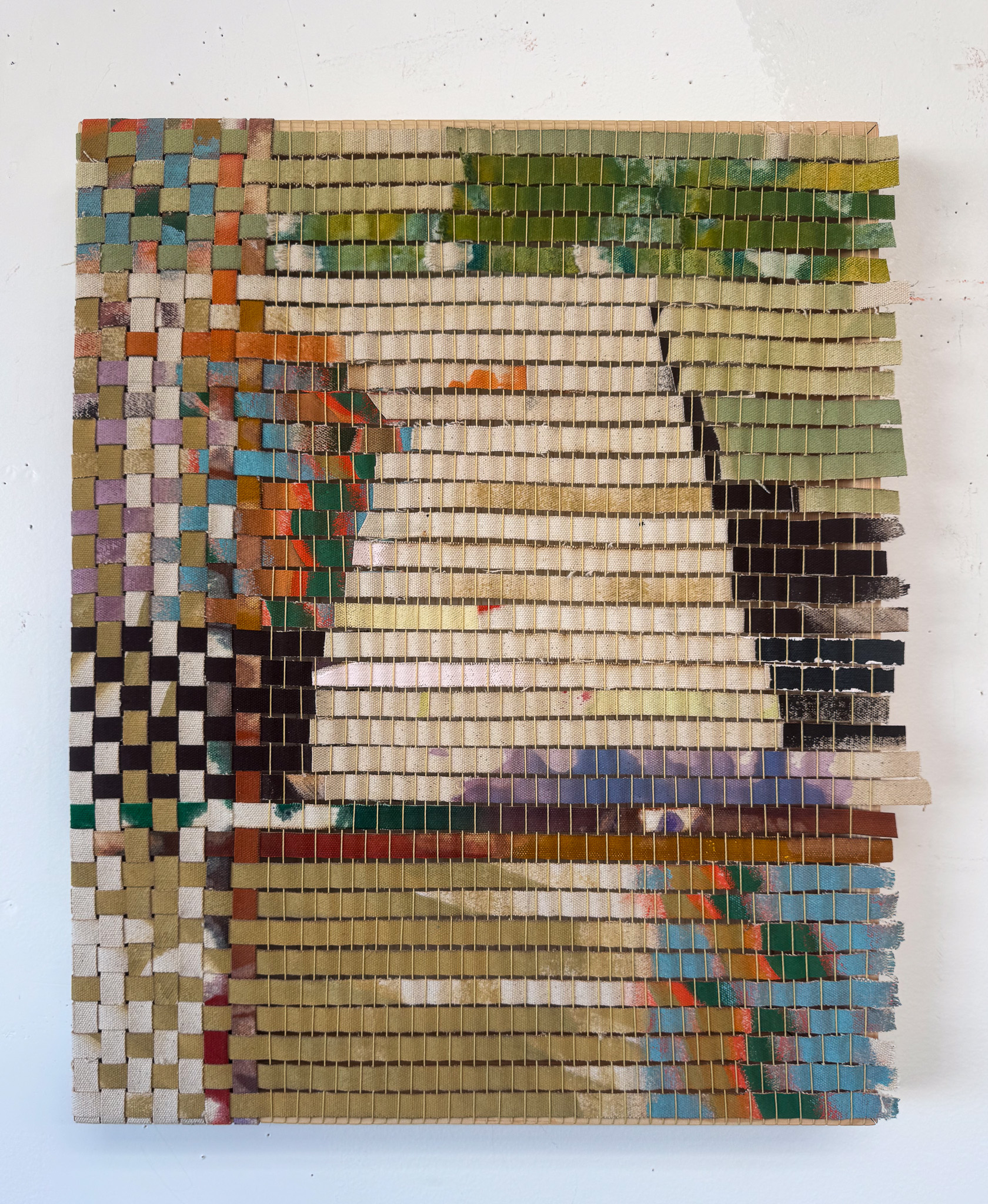 Arzabe’s work begins with acts of collection and analysis—sourcing paper ephemera from exhibitions, reproductions of modernist artworks, and other cultural remnants—which he systematically deconstructs and reconstructs through intricate processes of cutting, layering, and weaving. This methodology functions as both a formal and conceptual framework, positioning his work as a form of reverse-engineering that interrogates authorship, value, and the circulation of images within contemporary culture.