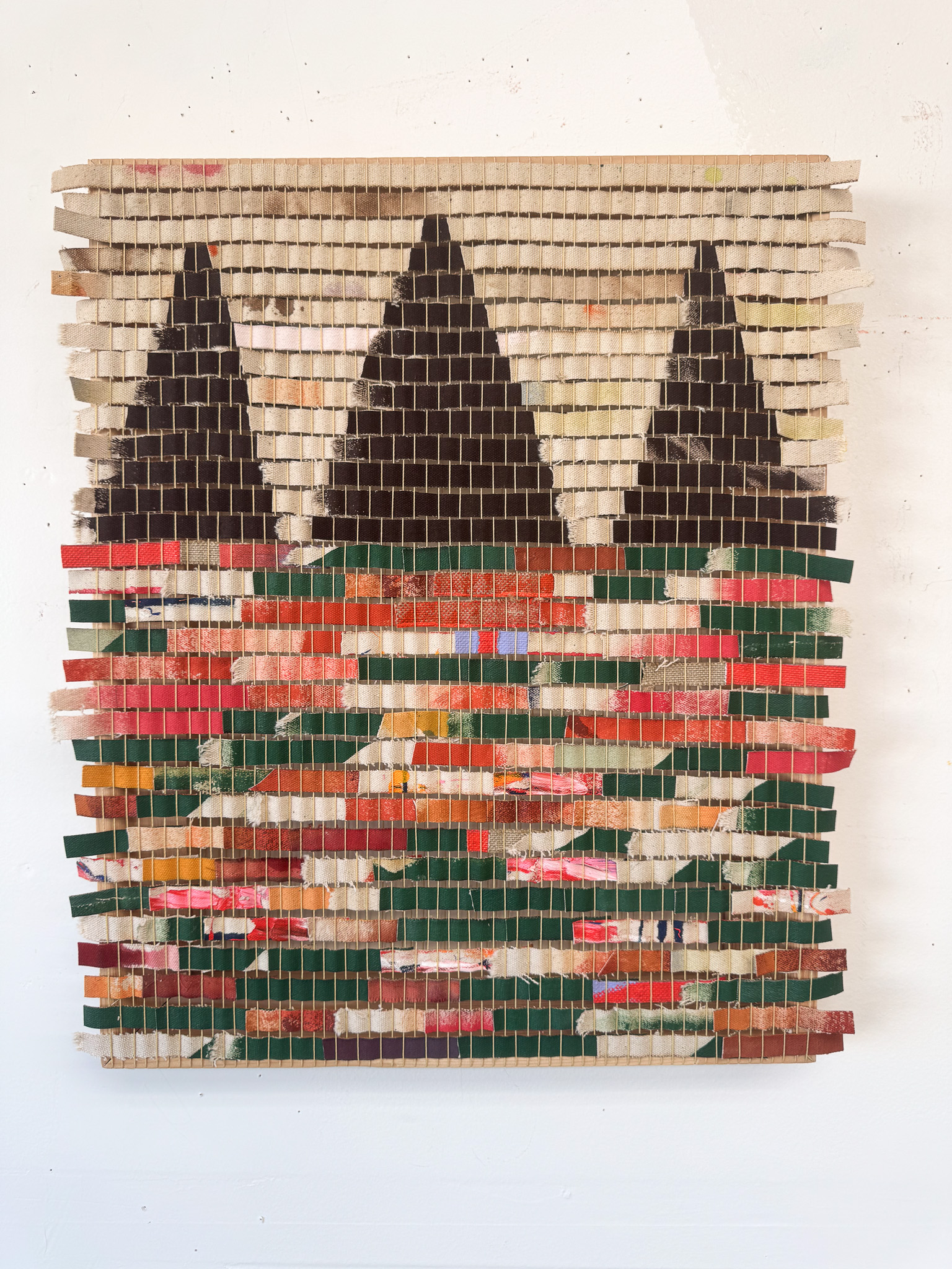 Drawing from the visual systems and techniques of Indigenous Andean textiles, Arzabe collapses distinctions between painting and weaving, creating hybrid works that exist simultaneously as image and object. His compositions retain the gestural immediacy of abstraction while embedding the physical structure of the weave, producing surfaces that oscillate between control and improvisation, fragmentation and cohesion.