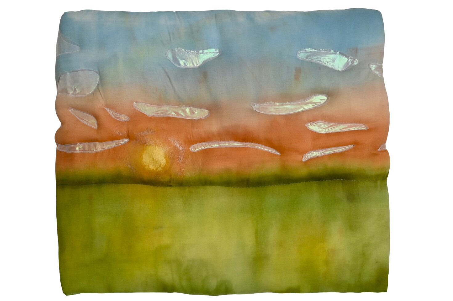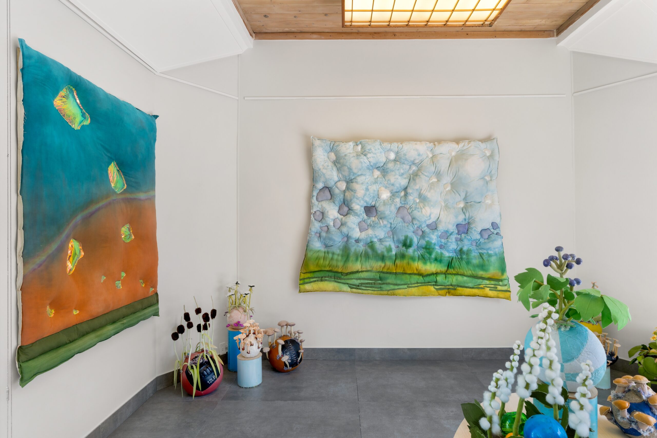Installed throughout the Garden’s gallery and grounds, Alfonso’s hand-dyed textile sculptures—made from reused fiberfill, salvaged textiles, and recovered playground balls—animate this urban oasis at what scientists call “ground zero” for climate change. Works such as Dawn Rainbow Landscape 3 (2025) and Bloodroot (2025) merge environmental awareness with a tactile, meditative process that honors both fragility and renewal.